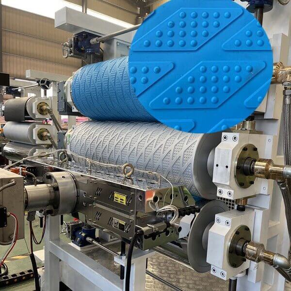 During the visit, clients received a comprehensive overview of the specialized extrusion lines designed for processing these versatile materials. The tour featured live demonstrations of a TPU anti-slip mat production line, अचूक एक्सट्रूजन, कार्यक्षम कूलिंग आणि अचूक कटिंग प्रक्रियांचे प्रदर्शन. ग्राहकांनी सानुकूल-डिझाइन केलेल्या स्क्रू आणि बॅरल्समध्ये विशेष स्वारस्य दाखवले जे विविध इलॅस्टोमर ग्रेडसाठी इष्टतम प्लास्टिसाइझिंग आणि मिक्सिंग सुनिश्चित करतात, ज्यामुळे उत्कृष्ट अँटी-स्लिप गुणधर्म, टिकाऊपणा आणि सौंदर्याचा अपील असलेल्या मॅटची गुणवत्ता सुसंगत होते.