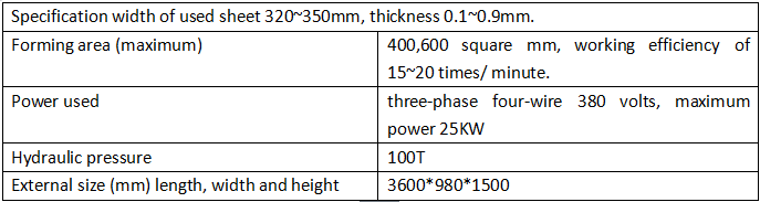 नर्सरी ट्रे सीडिंग मेकिंग मशीन टेक्निकल पॅरामीटर वापरलेल्या शीटची स्पेसिफिकेशन रुंदी: 300~320mm, जाडी: 0.8~2mm. फॉर्मिंग एरिया (जास्तीत जास्त): 400*600 मिमी, 15 ~ 20 वेळा/मिनिट कार्यक्षमता. वापरलेली पॉवर: थ्री-फेज फोर-वायर 380 व्होल्ट, कमाल पॉवर 25KW हायड्रोलिक दाब: 100T बाह्य आकार (मिमी) लांबी, रुंदी आणि उंची) 3600 मिमी * 980 मिमी * 1500 मिमी